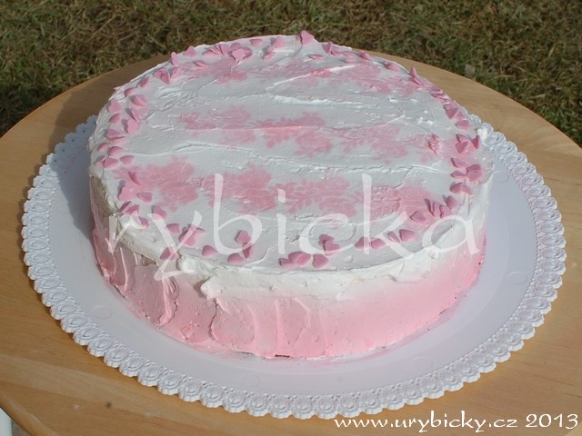Dort má průměr 26cm a 18cm, výška korpusů celkem 15cm, váhu 3,1kg, korpus kakaový v obou patrech, vanilkovo-oříškový krém, višňová a meruňková náplň. Potaženo hmotou White Icing. Květy modelované na drátkách, 4 listy papírové.